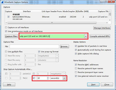 開啟wireshark,設置捕獲參數(“Capture Options”),選中“本地連接”,并設置過濾器和停止時間,并點擊“Start”,如下圖所示:
