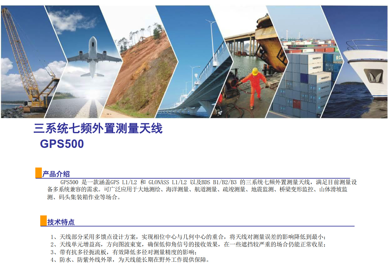 GPS500 是一款涵蓋GPS L1/L2 和 GLONASS L1/L2 以及BDS B1/B2/B3 的三系統七頻外置測量天線,滿足目前測量設備多系統兼容的需求??蓮V泛應用于大地測繪、海洋測量、航道測量、疏竣測量、地震監測、橋梁變形監控、山體滑坡監測、碼頭集裝箱作業等場合。...